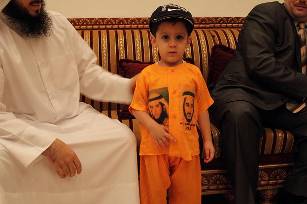 عدسات قنوات الاعلام ويبدو ظهور احد الاطفال مرتدي لباس معتقلين غوانتانامو
