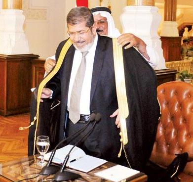 رئيس مكتب «عبس» المستشار المصري محمد مبارك الرشيدي يضع «البشت» على كتفي مرسي