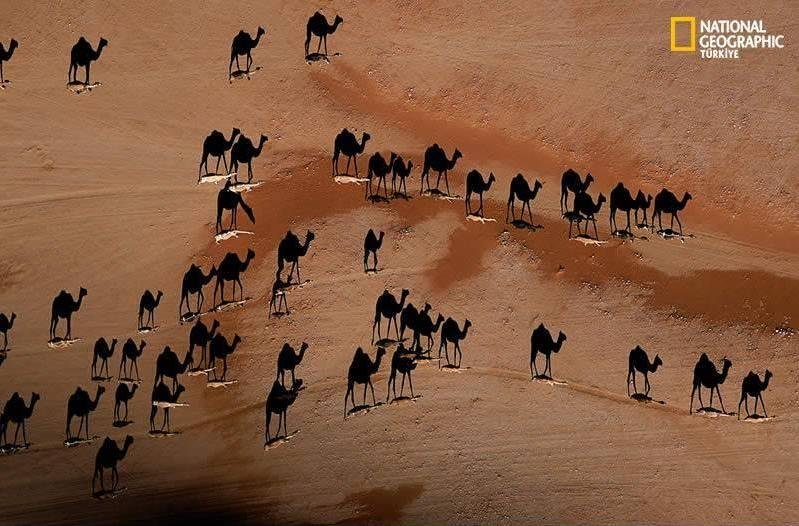 الصورة مأخوذة من أعلى ويظهر لون الجمال باللون الأبيض وأما اللون الأسود ماهو إلا ظل للجمآل 'دقق بالصورة '