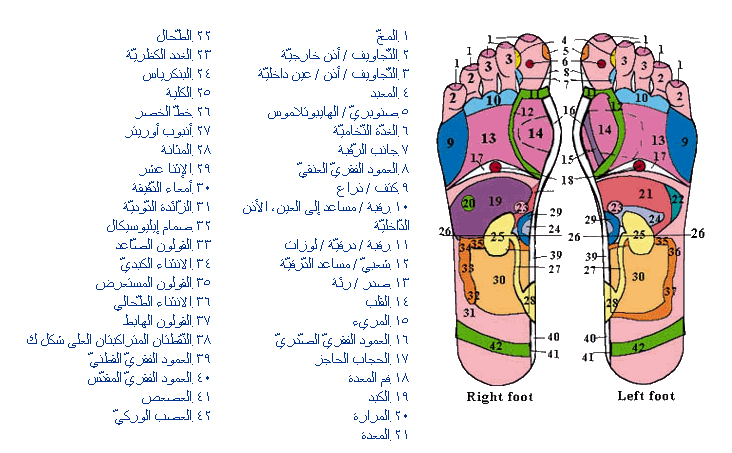 يمكن تقسيم مناطق انعكاسات القدم بحسب أجهزة الجسم المختلفة كالآتي: