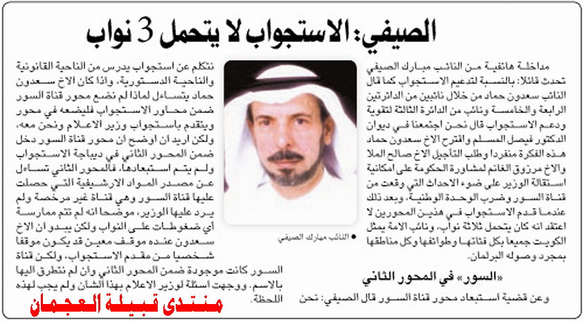 مداخلة هاتفية من النائب مبارك الصيفي تحدث قائلا: بالنسبة لتدعيم الاستجواب كما قال النائب سعدون حماد من خلال نائبين من الدائرتين الرابعة والخامسة ونائب من الدائرة الثالثة لتقوية ودعم الاستجواب قال نحن اجتمعنا في ديوان الدكتور فيصل المسلم واقترح الاخ سعدون حماد هذه الفكرة منفردا وطلب التأجيل الاخ صالح الملا والاخ مرزوق الغانم لمشاورة الحكومة على امكانية استقالة الوزير على ضوء الاحداث التي وقعت من قناة السور وضرب الوحدة الوطنية، وبعد ذلك عندما قدم الاستجواب في هذين المحورين لا اعتقد انه كان يتحمل ثلاثة نواب، ونائب الامة يمثل الكويت جميعا بكل فئاتها وطوائفها وكل مناطقها بمجرد وصوله البرلمان.